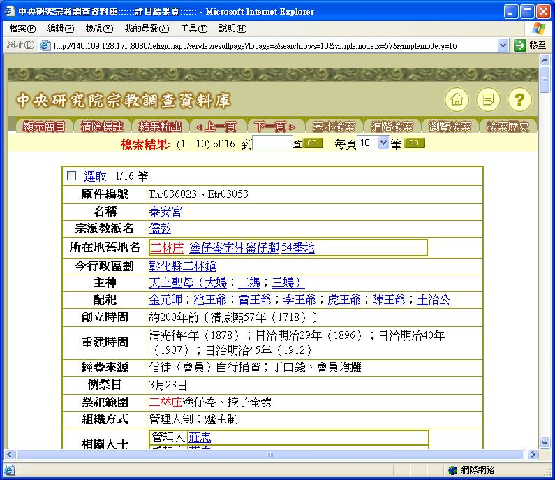 餘頁文件之數位處理。本資料庫係根據台灣史研究所籌備處及民族學研究所兩單位所典藏之宗教調查資料進行建置,記錄時間從日治明治時期到民國八十年代為止,其中最重要的文獻為宗教台帳,調查時間集中在日治大正年間,為日人治台期間對全台宗教活動的大規模調查記錄,是非常珍貴的台灣宗教活動歷史文獻。